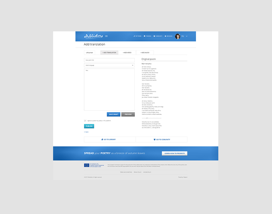 2) Kuriančiai bendruomenei skirta platforma, kurioje poetai skelbia savo kūrybą, bendrauja tarpusavyje, o vertėjai jiems patikusius kūrinius verčia į kitas kalbas.