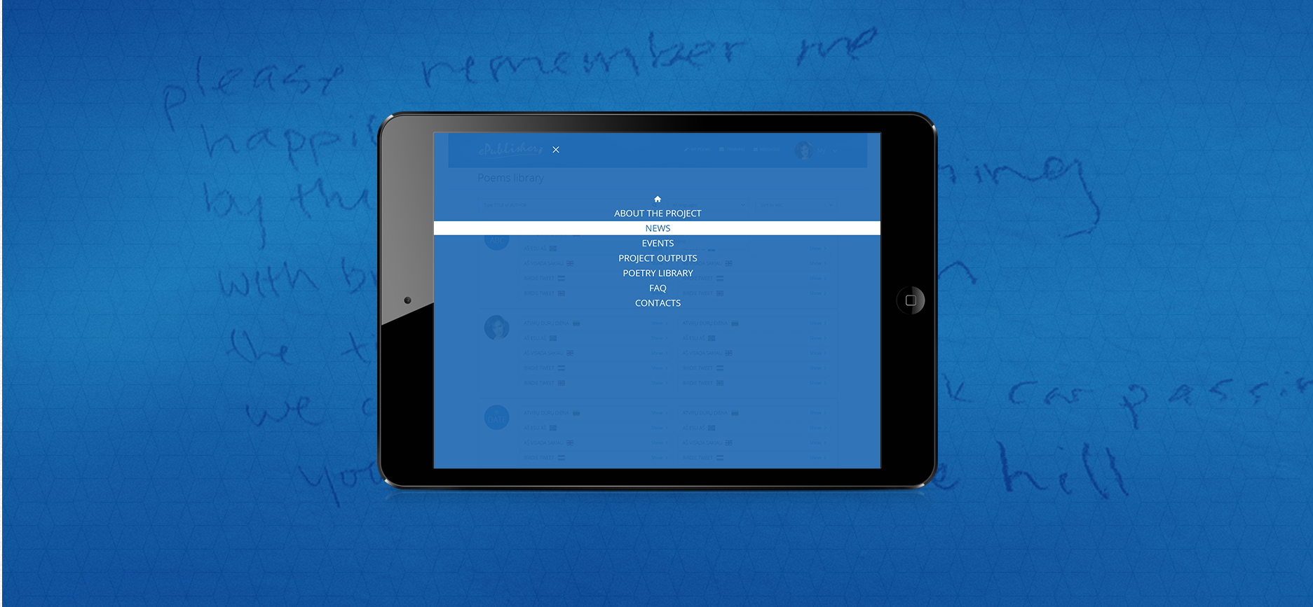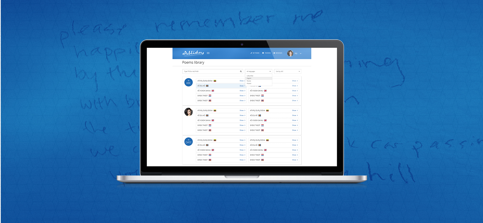 The dedicated place that allows to publish and translate the poems. The place that allows writers to network. The place that allows to store work and allows various sorting options (by country, author, language.. )