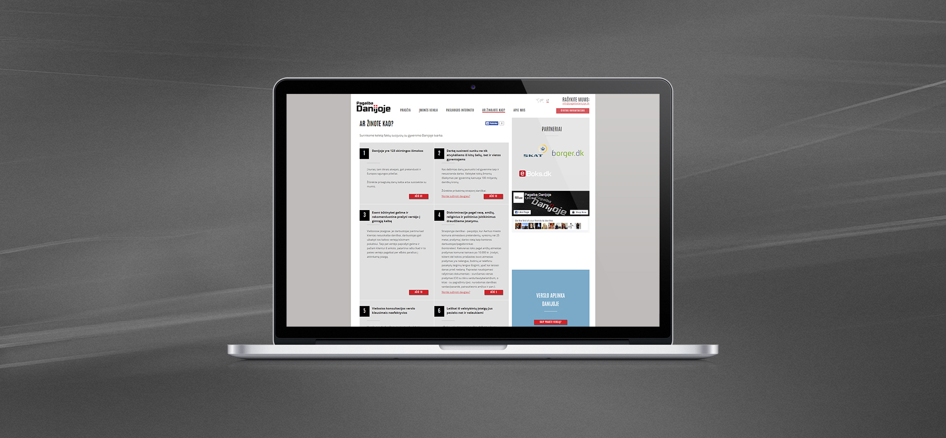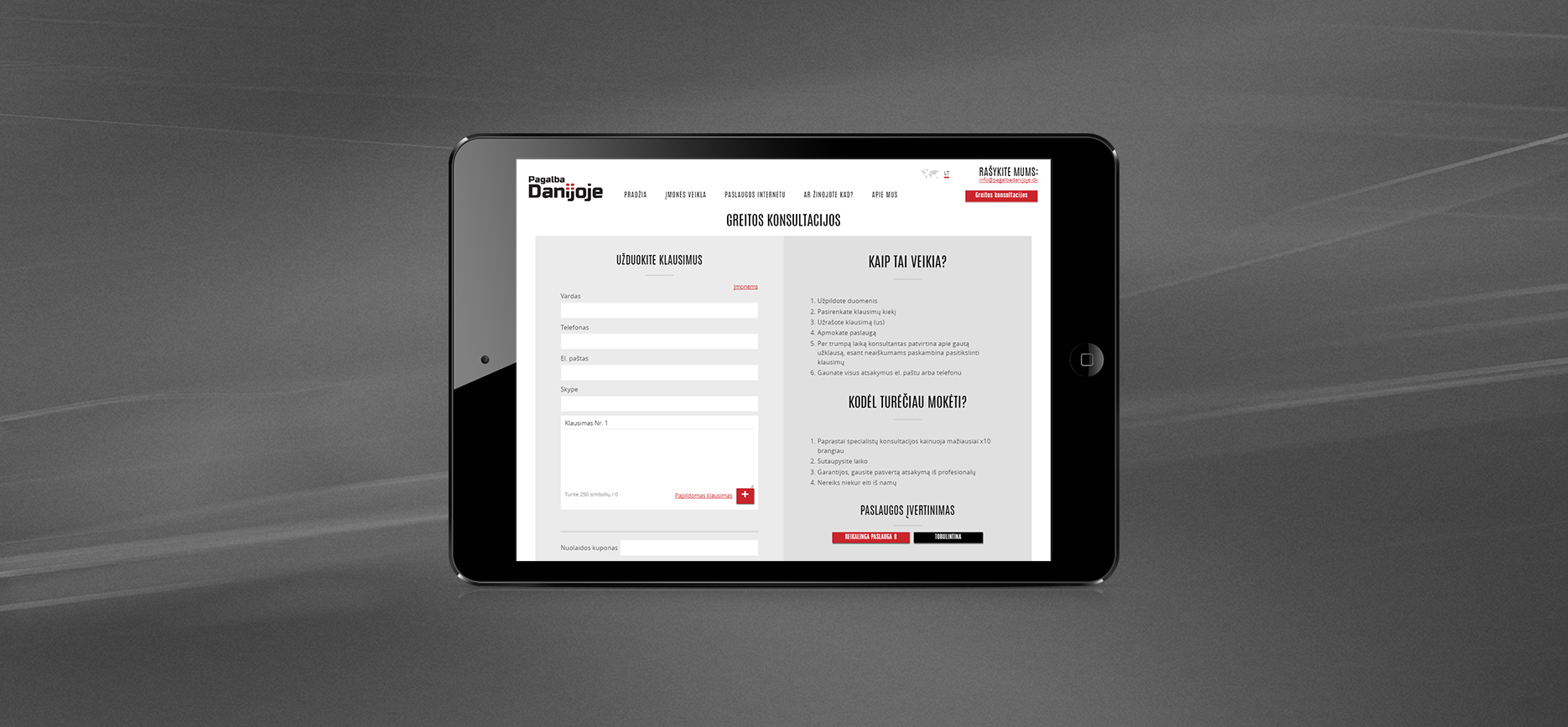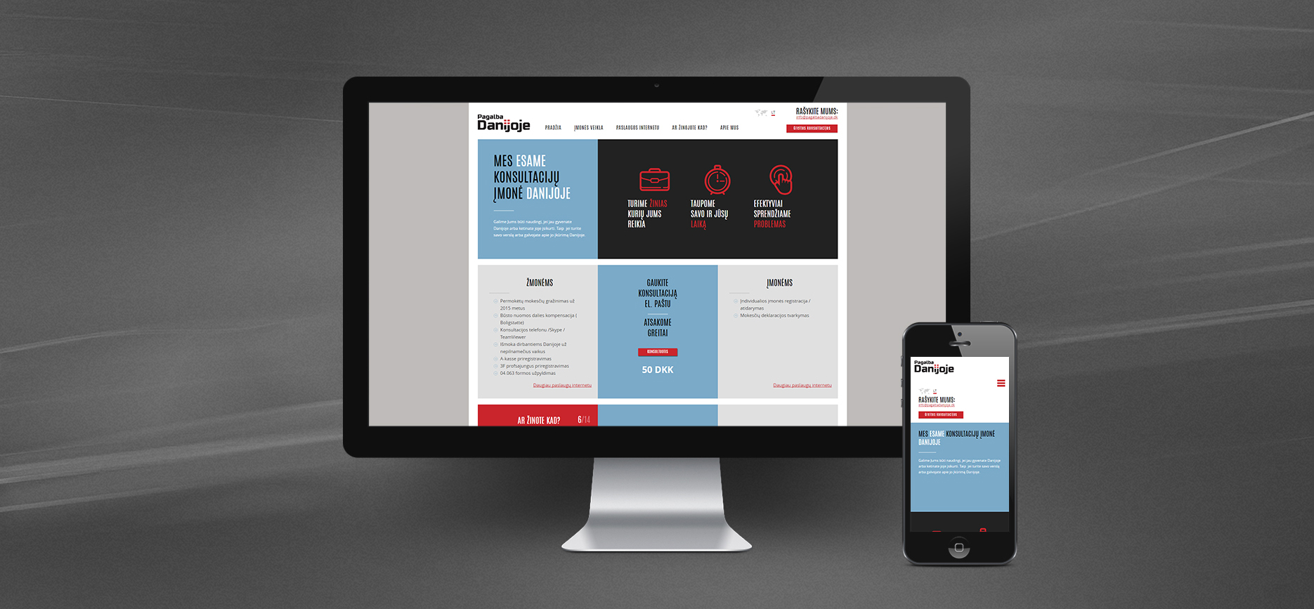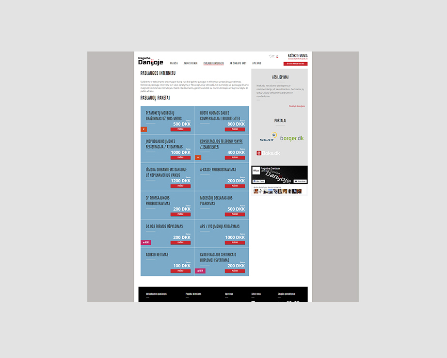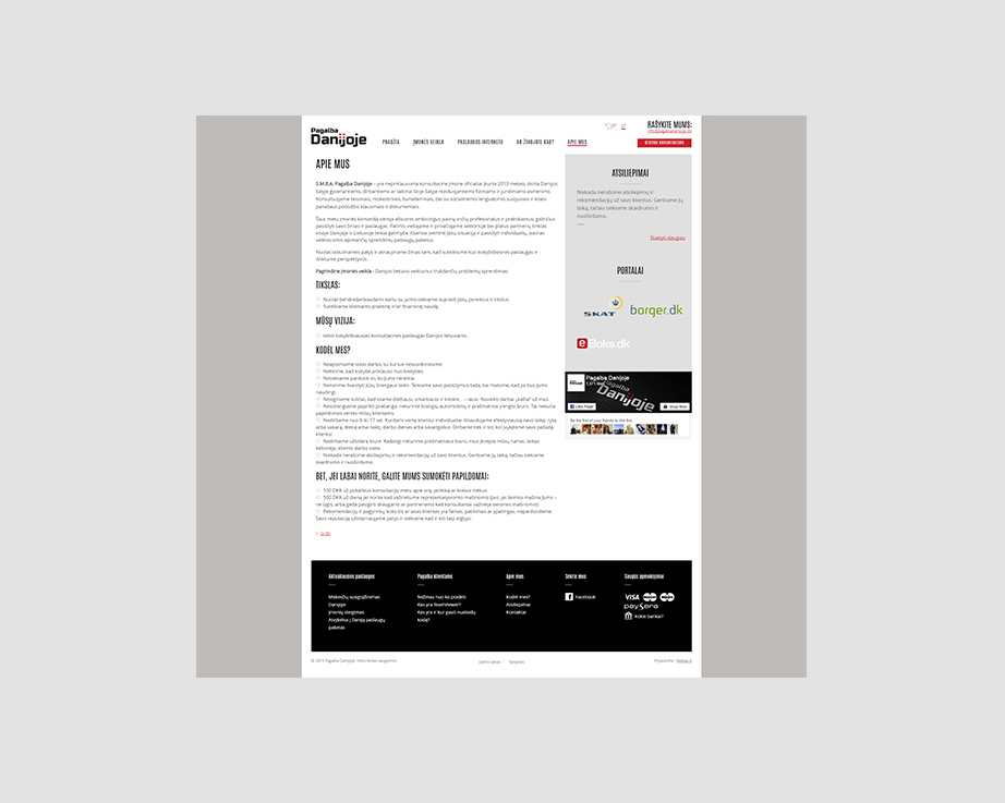 Klientui reikalingas interneto sprendimas, kuris ne tik reprezentuotų įmonės konsultacinę veiklą Danijoje, bet taip pat leistų gauti apmokėjimą už paslaugas prieš jas suteikiant, taupytų laiką tiek paslaugas teikiančiai įmonei, tiek jų klientams.