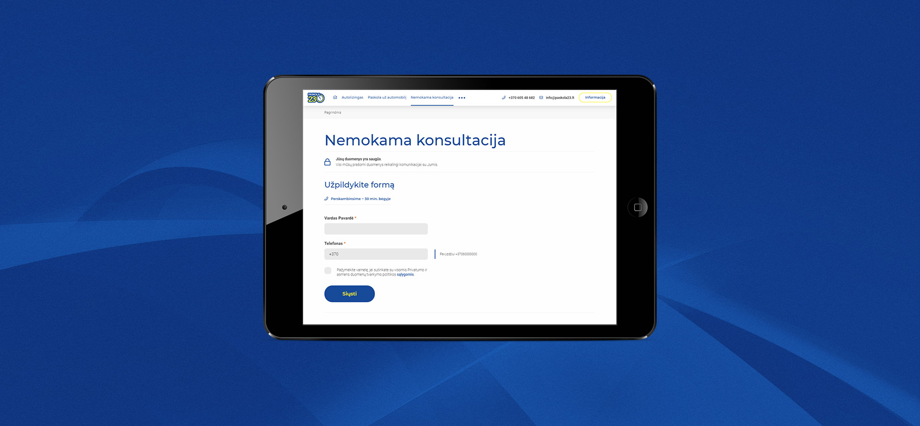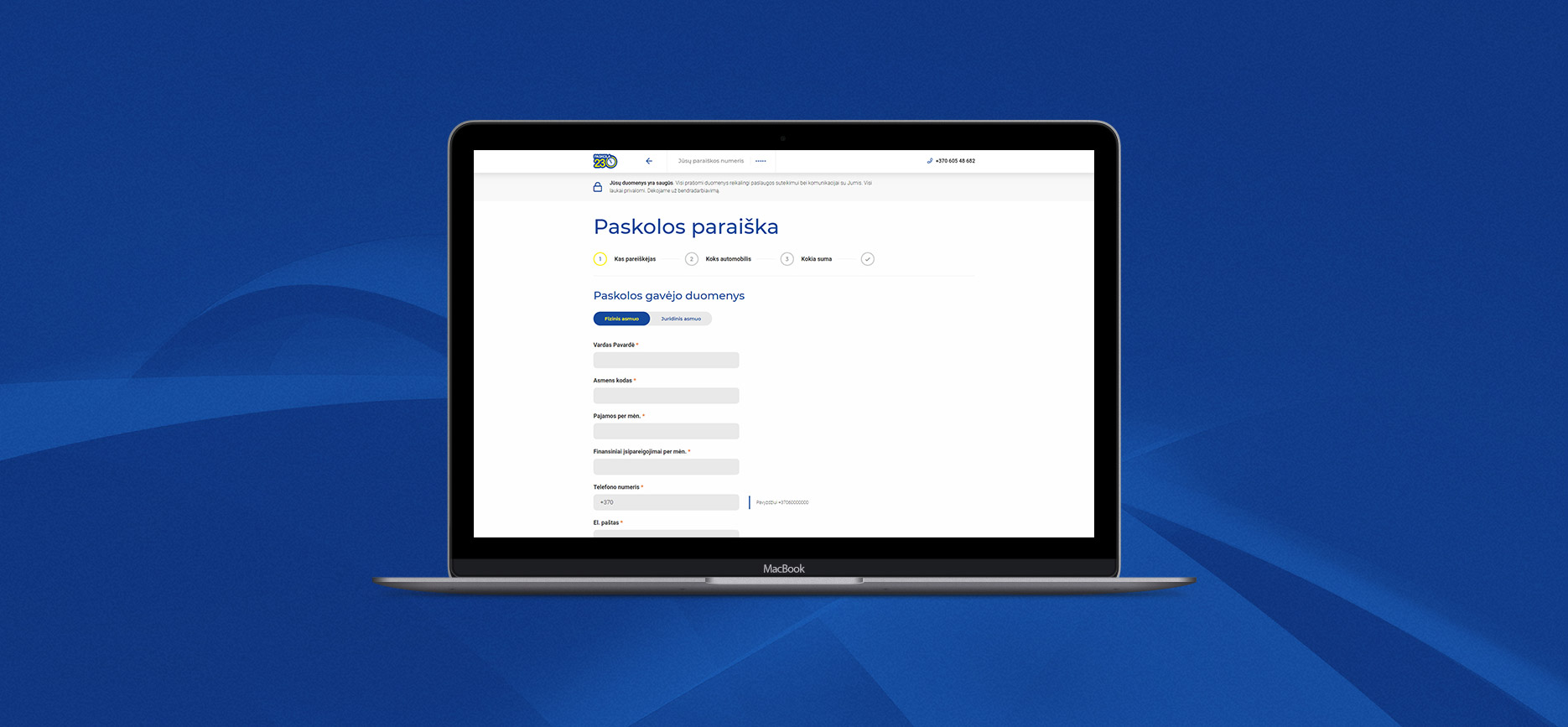 Kitas įdomesnis iššūkis buvo teisingai išspręsti paraiškų rinkimo momentą. Savo praktikoje esame pastebėję, kad perilgos anketos nėra gerai, todėl pasiūlėme ir įgyvendinome pažingsninę anketą. Skirtingoms paslaugoms sukurtos skirtingos anketų versijos, o vyšnė ant torto yra duomenų išsiuntimas į CRM sistemą, el. pasirašymo ir asmens identifikavimo technologijos Dokobit integracija.