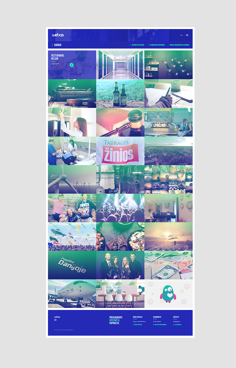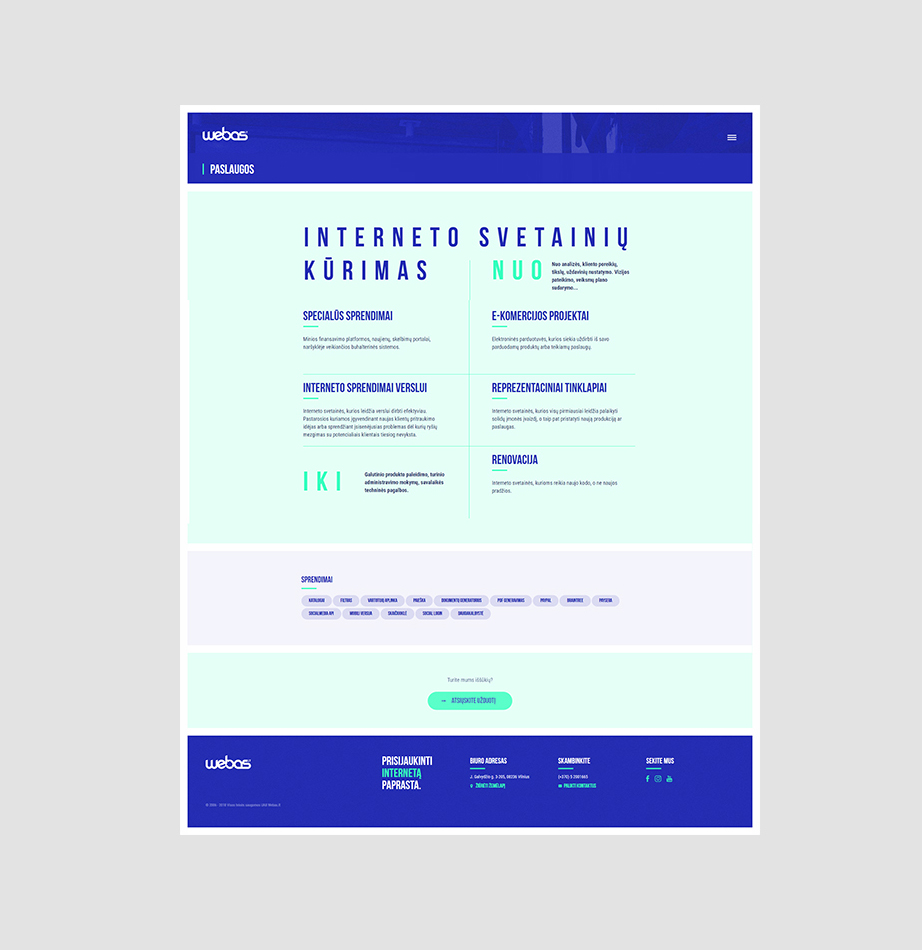 Taip susiklostė aplinkybės, kad 2017 metais turėjome skirti dėmesio sau. Per laiką išsigrynino įmonės veiklos kryptys, išryškėjo keletas nišinių paslaugų, kurias iškraustėme į atskiras internetines erdves. Webas.lt vardas liko tik mūsų pagrindinei, kūrybingų interneto projektų kūrėjų, profesionalų veiklai pristatyti.
