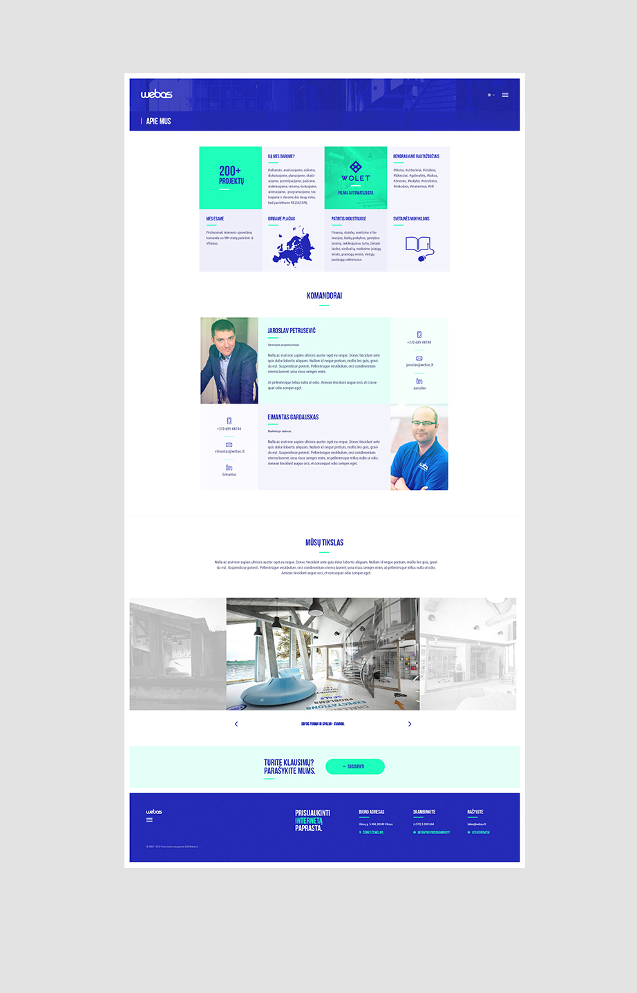 Skiltyje "Apie mus" pristatome mūsų komandorus. Tai žinia apie žmones, su kuriais reikia kalbėtis dėl naujų projektų. Sąmoningai, komandoje neturime tik pardavėjo pozicijos. Mūsų supratimu, tik kūrybiniame/ gamybiniame procese esantis žmogus gali iki galo suprasti, ką parduoda.