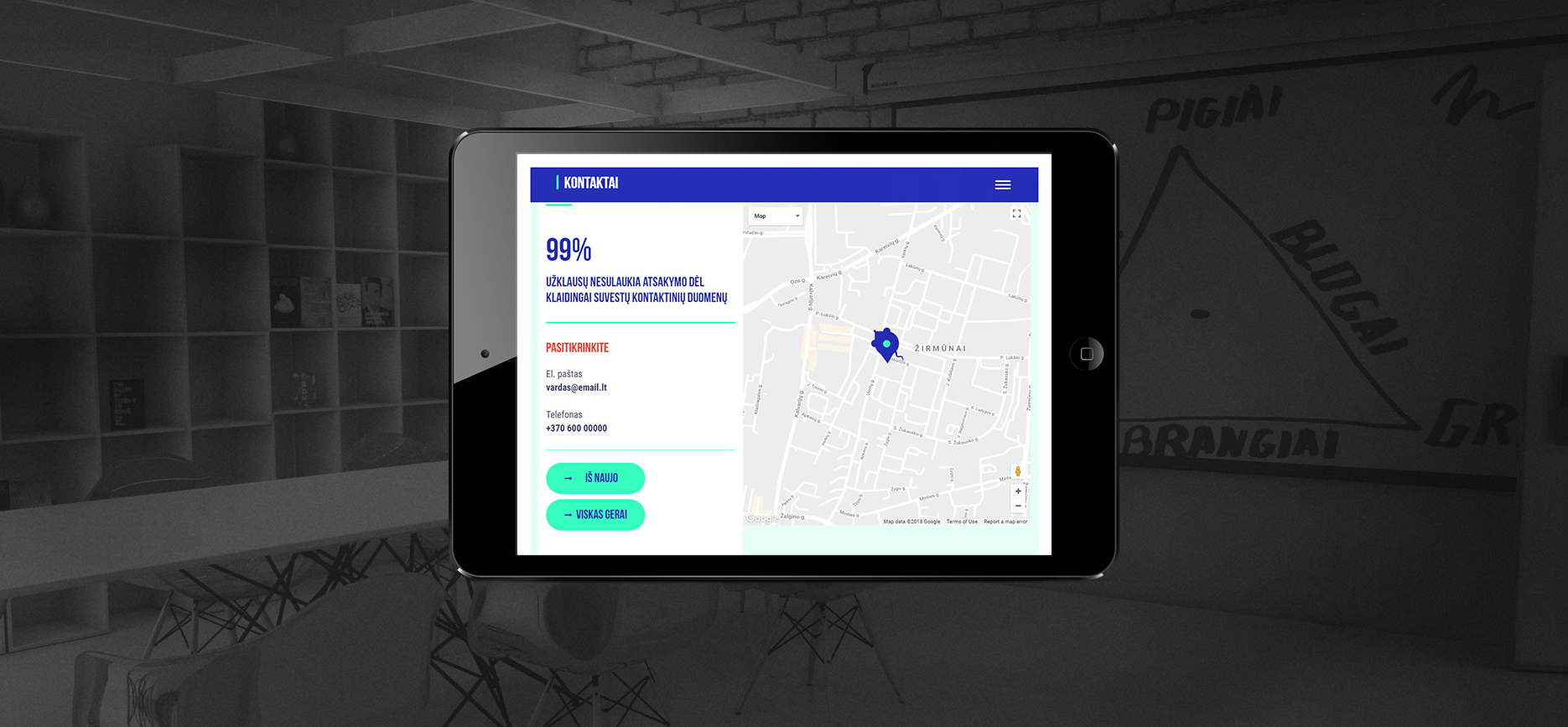 Kontaktuose sudėjome visą reikalingą informaciją, kad klientai nenueitų pas konkurentus, o kuo lengviau mus surastų.